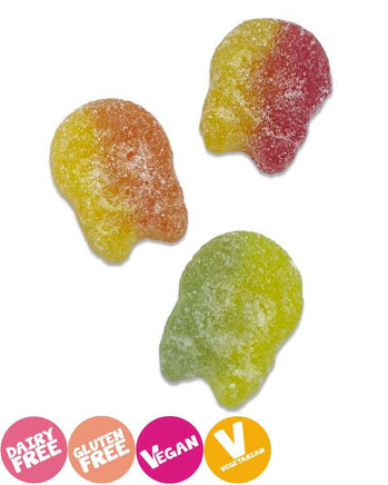 Delicious fruit flavour jelly foam sweets with a sour coating, the perfect combination of sweet and sour. Suitable for vegetarians, these tasty sour skulls can be enjoyed by all.