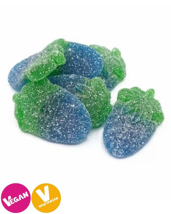 These Sour Blue and green sugar dusted jelly sweets by Kingsway are bursting with blue raspberry flavour.