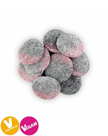 Red and black Raspberry and Liquorice sunsets with a fizzy sugar coating.