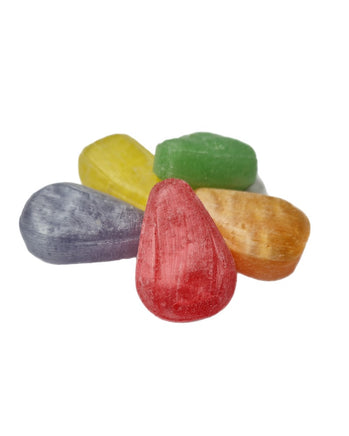Unwrapped assorted fruit flavoured hard boiled sweets in the shape of a pear.