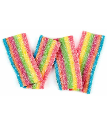 Fizzy assorted fruit flavoured rainbow coloured belts.