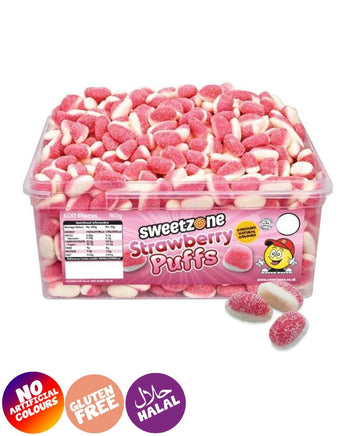 Sweetzone Strawberry Puffs are tasty, sugar coated little strawberry shaped sweets with a pink strawberry flavoured top and a white vanilla flavoured bottom.